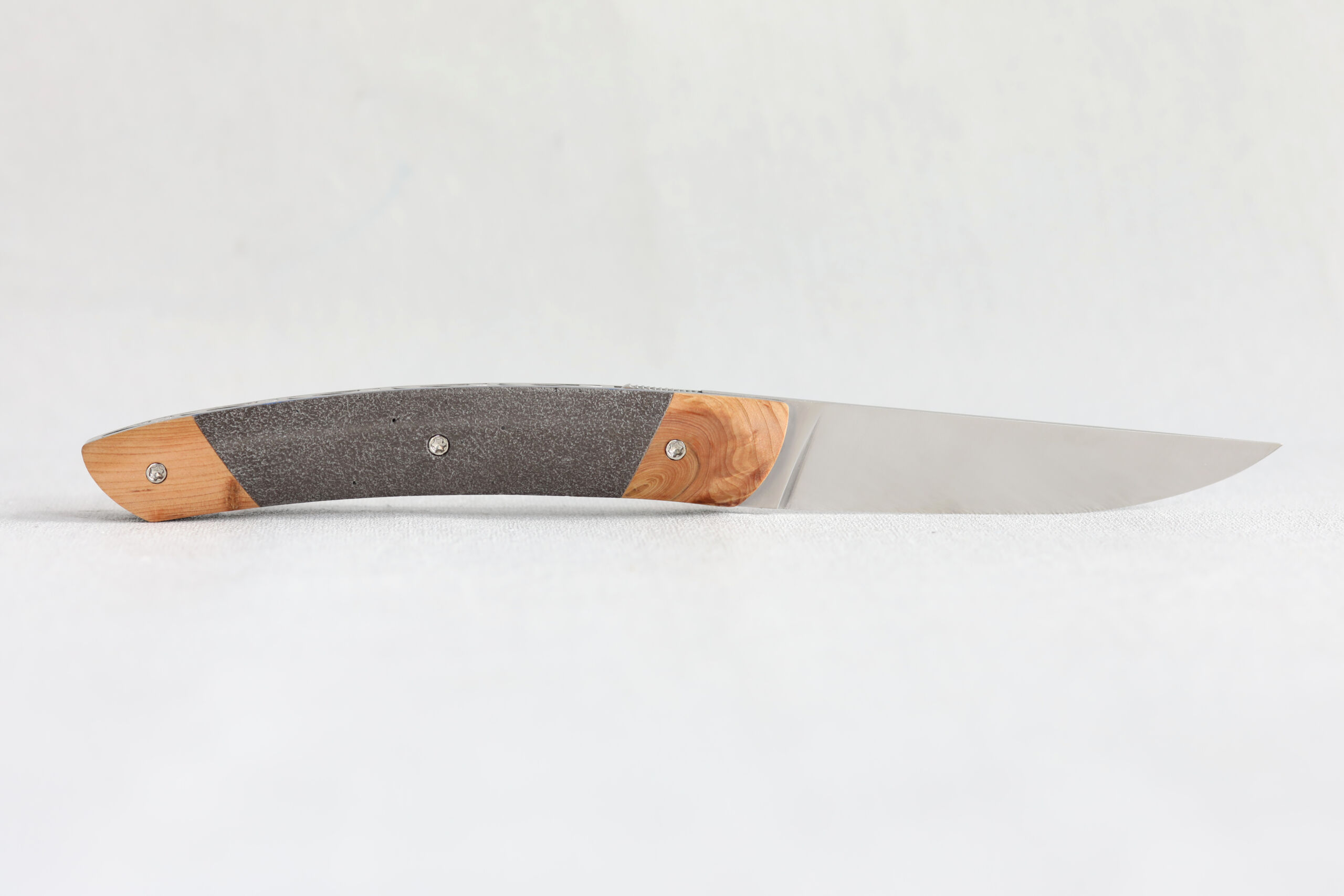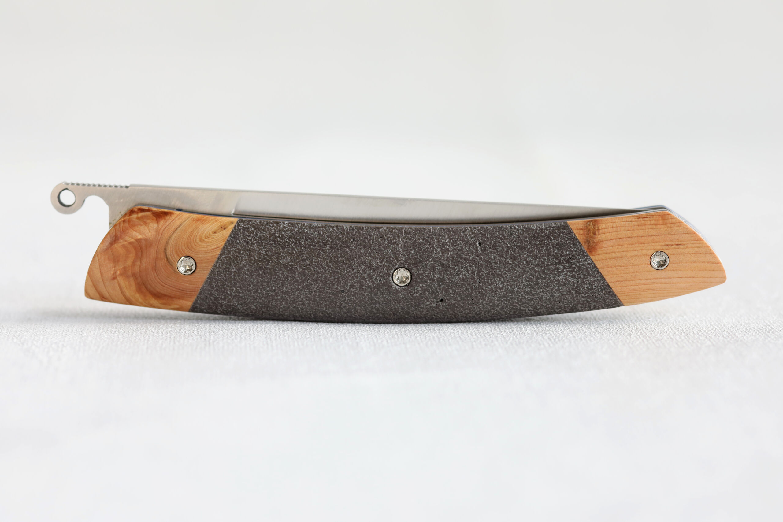 Son manche associe la lave volcanique issue du Puy de la Nugère, l’un des volcans emblématiques de la Chaîne des Puys en Auvergne, à la chaleur du bois de genévrier, réputé pour son veinage délicat et son parfum subtil. Cet équilibre entre minéral et végétal confère au couteau une esthétique rare, une texture singulière et un toucher incomparable.